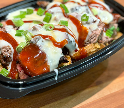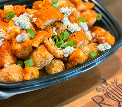 Seasoned Tots, Buffalo Chicken, Green Onion, and finished with Buffalo Sauce and Blue Cheese Crumbles