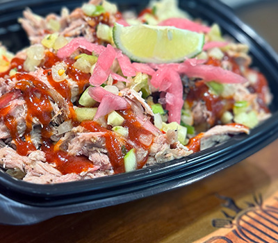 Choice of Meat, Corn chips, Queso, BBQ, Salsa, Cilantro